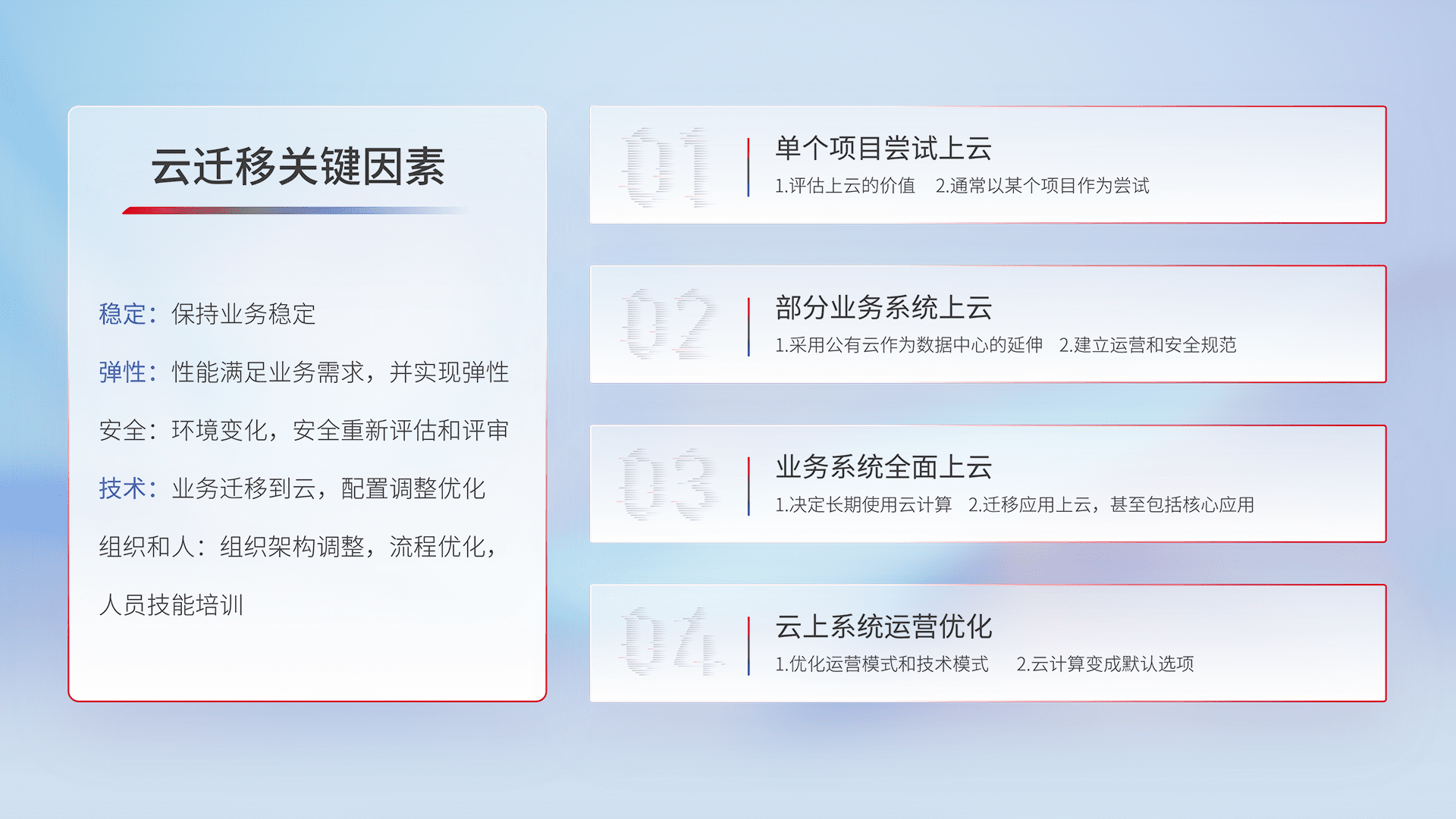 结合实际业务,,从规划设计、、云平台选型、、、、云原生改造、、、数据迁移、、、集成交付,,迁移全过程为客户识别最佳上云路径,,,做好风险识别管理,,,,设计网络架构、、、身份权限、、、、安全审计合规、、操作审计、、日志审计、、、监控告警策略、、、、多站点容灾设计等,,,,对云上基础设施进行整体规划,,,,提升IT治理水平,,以满足弹性、、、、高可用、、、高性能的需求。。。。