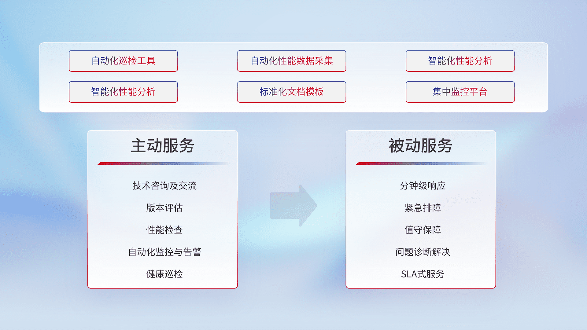 智能化工具和标准化文档,,,,保障服务质量,,,提供主动服务(包含技术咨询、、版本评估、、性能检查、、自动化监控与告警、、、健康巡检)和被动服务包含(分钟级响应、、紧急排障、、值守保障、、、问题诊断解决、、、SLA服务)。。