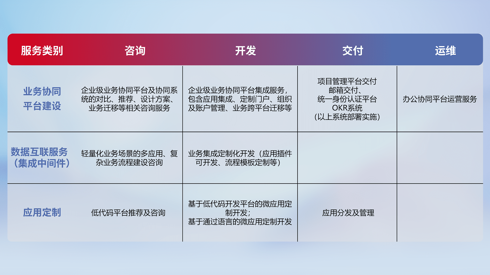 针对钉钉、、、、企微、、、IDaas等平台级产品提供产品的规划、、方案、、、、交付、、、、定制化开发等服务,,实现如统一协同办公、、、智能客户服务、、混合会议管理、、、智能数据查询、、、等业务场景,,,实现数字化转型。。。。